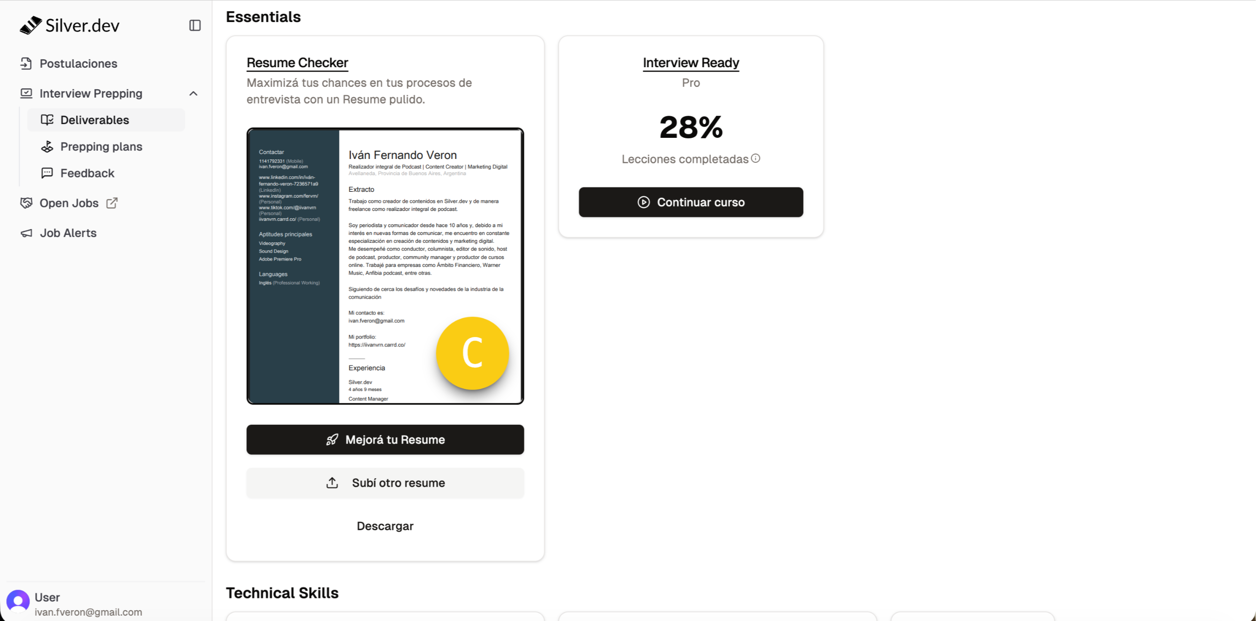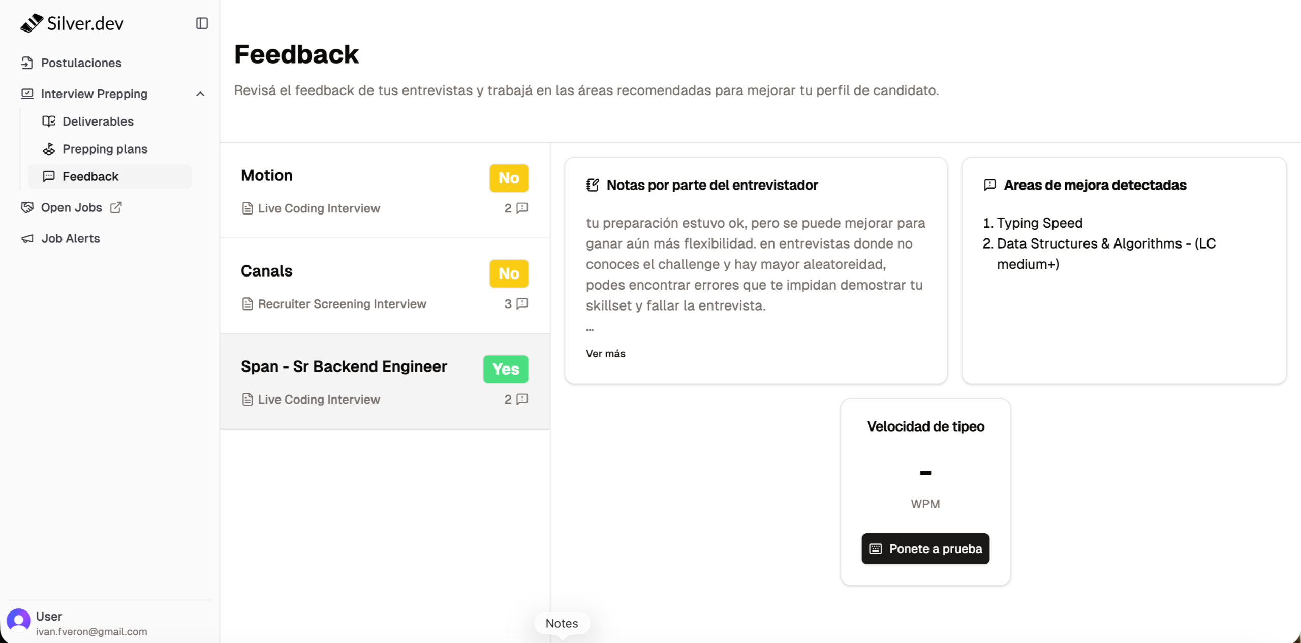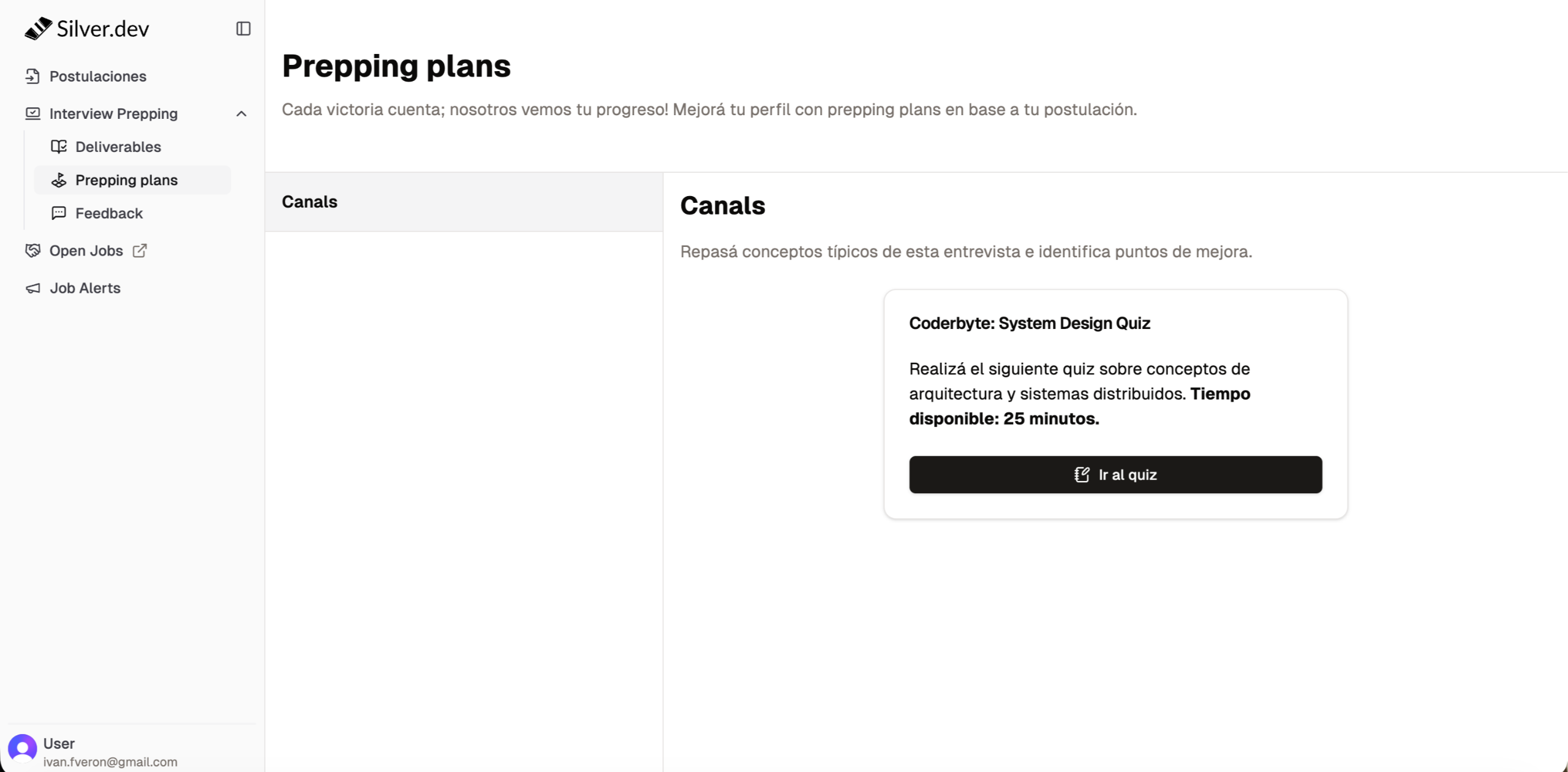 Los entregables de Interview Ready se realizan dentro de la plataforma de Silver.dev. Esto permite centralizar mock interviews, feedback y ejercicios prácticos en un solo lugar, hacer seguimiento de tu progreso y trabajar sobre áreas concretas de mejora a lo largo de tu preparación.